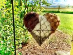 This bird nesting heart is puffy on the front and flat on the back. Perfect to go up against a wall on a porch. It can also be hung in a tree by a nest. The birds will pluck the fiber to build their nests for the baby birds. Alpaca fiber is warm and will make a cozy nest. There are also bits and pieces of hay in this raw fiber, also great for the bird nests.