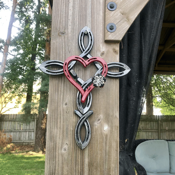 This Natural horsehsoe cross with heart is made of recycled horseshoes, adhering to the concept of environmental protection, and discovering the goodness that can be used in life, each one is unique.