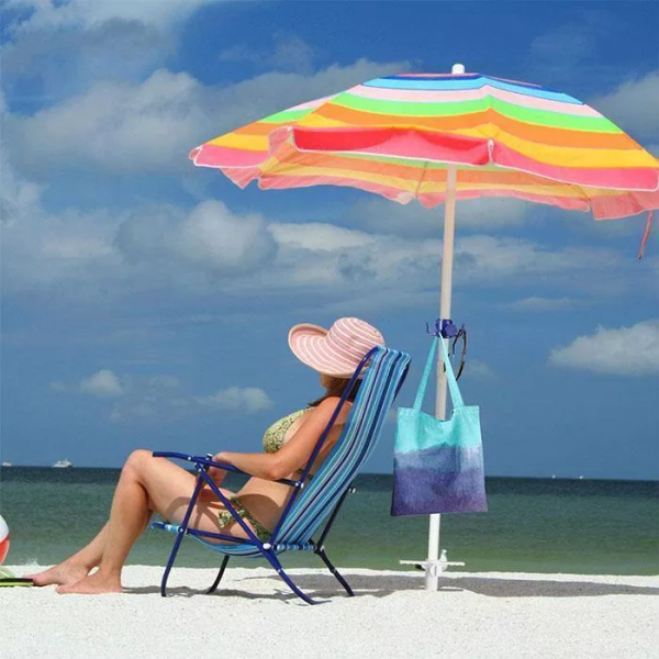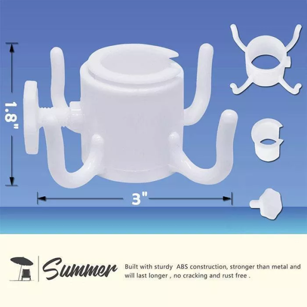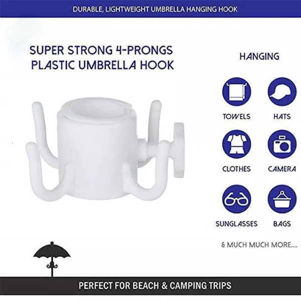This umbrella hook is compact and sturdy. Designed from high quality, lightweight and durable polypropylene to ensure the 4 hooks do not snap or break. Provides the ideal solution for larger items such as towels, digital cameras, beach bags as well as small items such as sunglasses, cameras, Phone that you don’t want to get sandy, wet and dirty.