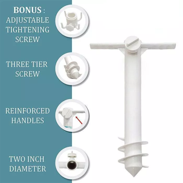 Simply screw the auger into the sand, dirt or grass, place your umbrella in the base holder, then simply position the Umbrella Hook exactly where you want it and fasten the screw to hold it in place, and enjoy time with your family at the beach instead of continuously fixing a falling beach umbrella.