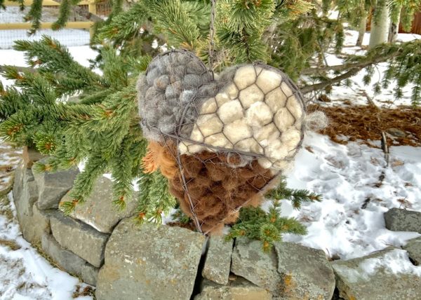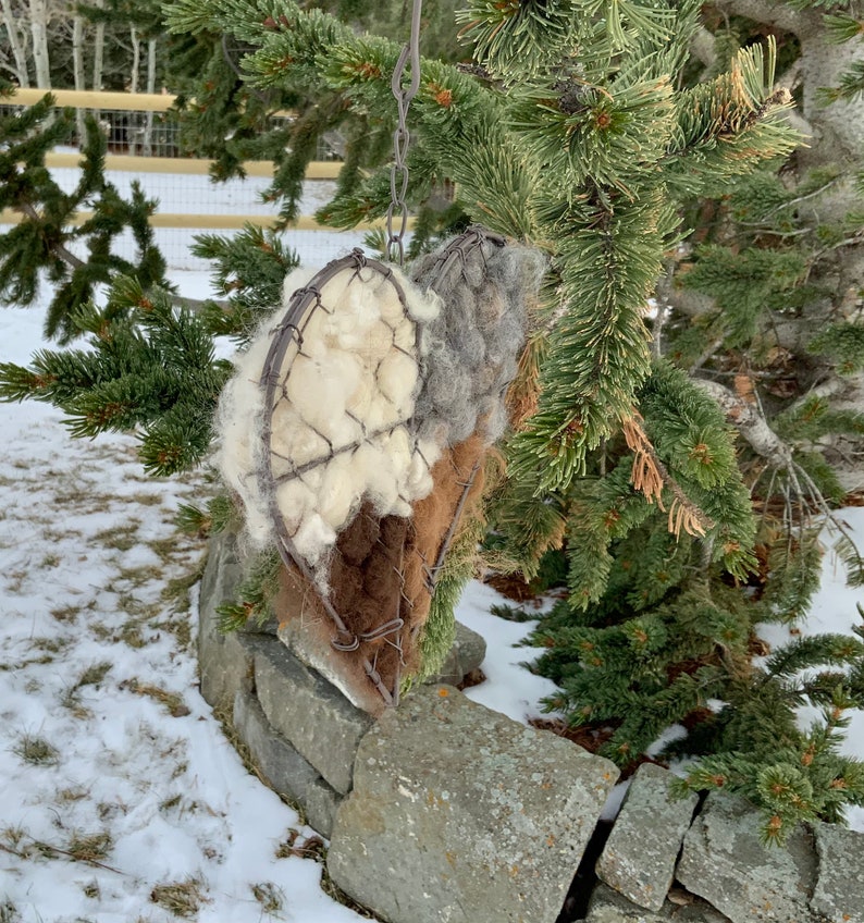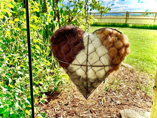 This bird nesting heart is puffy on the front and flat on the back. Perfect to go up against a wall on a porch. It can also be hung in a tree by a nest. The birds will pluck the fiber to build their nests for the baby birds. Alpaca fiber is warm and will make a cozy nest. There are also bits and pieces of hay in this raw fiber, also great for the bird nests.