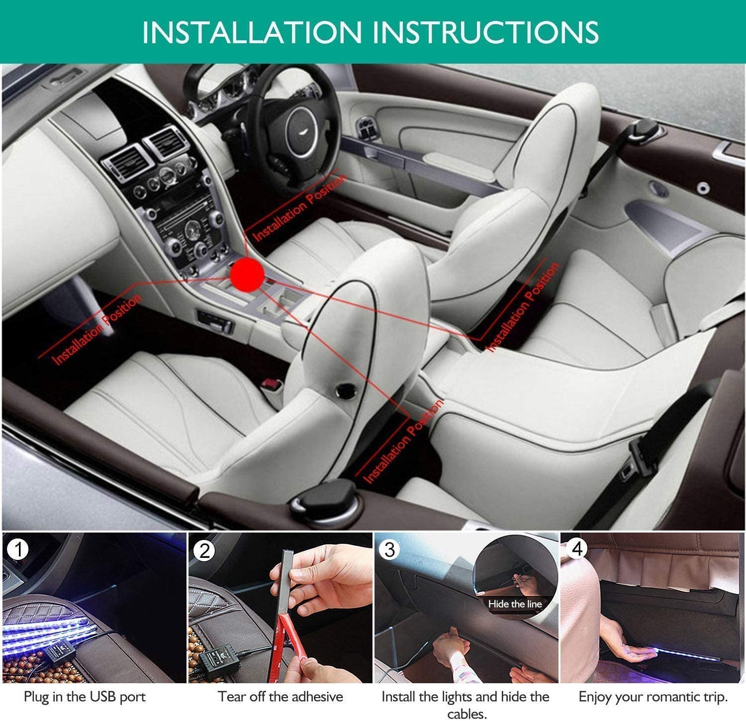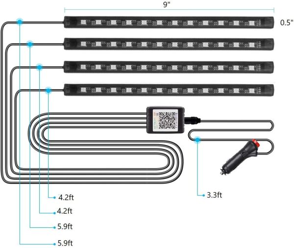 - EASY TO INSTALL: Our 4 interior car lights strip come in one pack connected to a small box. The length of the cords are 2 different sizes(4.2&5.9ft/1.3m&1.8m) so one can reach the back and one in the front seat. There’s quality adhesive tape that helps the lights to stay firmly at the car interior surfaces. Directly insert it in the cigar lighter socket, scan the QR code and download the application.