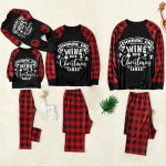 Christmas- Running on Wine and Christmsa Cheer- Letter Print Patterned Contrast Black top and Black & Red Plaid Pants Family Matching Pajamas Set With Dog Bandana