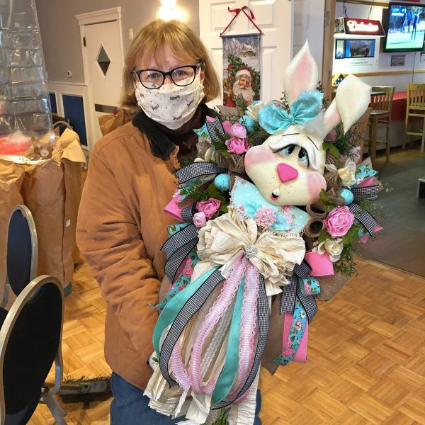 This design is measuring approximately 12″ tall (from top of ears to bottom of bow tails), about 16″ wide (where greenery/flowers/accents stick out).