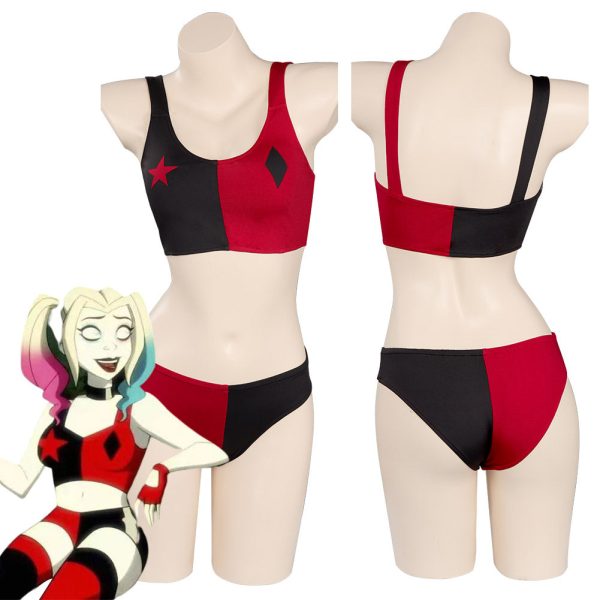 Made from high-quality materials, this Harley Quinn swimsuit is designed to be comfortable and durable, so you can wear it again and again. The costume features a striking black and red color scheme, complete with a printed emblem on the chest that replicates Harley Quinn’s signature outfit. The two-piece design includes a crop top with adjustable straps and high-waisted shorts, both featuring Harley’s iconic diamond pattern.