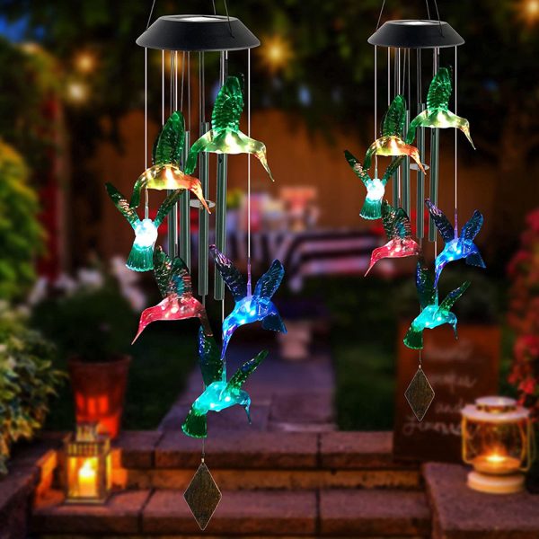 At night, adorable wind chimes will light up your yard and rooms, with each playful hummingbird radiating wonderful color.