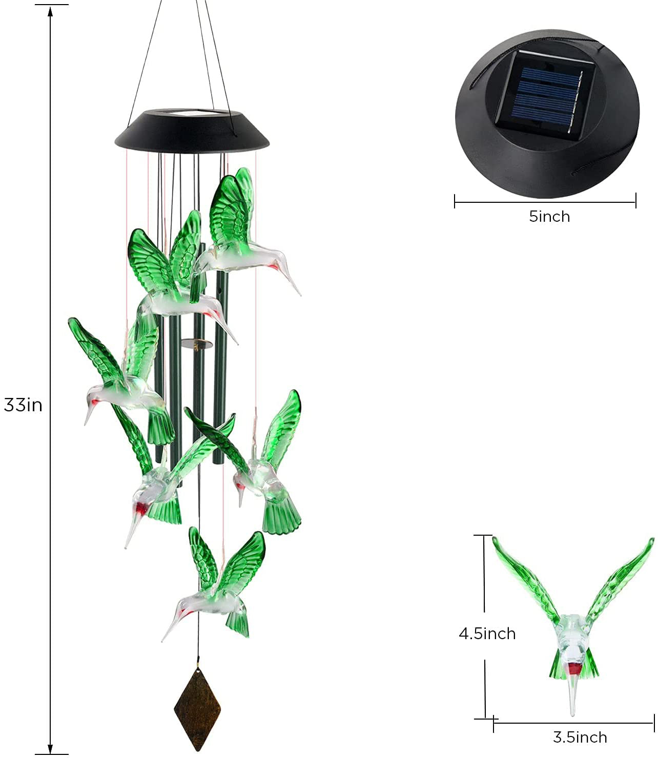 Wind Chimes Glowing-Changing colors alternating randomly between Red, Green, Orange, Blue, Yellow, Purple, shine and colorful Hummingbird at night. They will change various kinds of brilliant colors, making your garden and yard more romantic - Clear Sound-Large deep tone wind chimes have 4 high-quality aluminum tubes. Unique high density wood striker and different lengths thicken aluminum tube, creates a longer lasting deep tone.The sound is soft,deep tone and relaxing