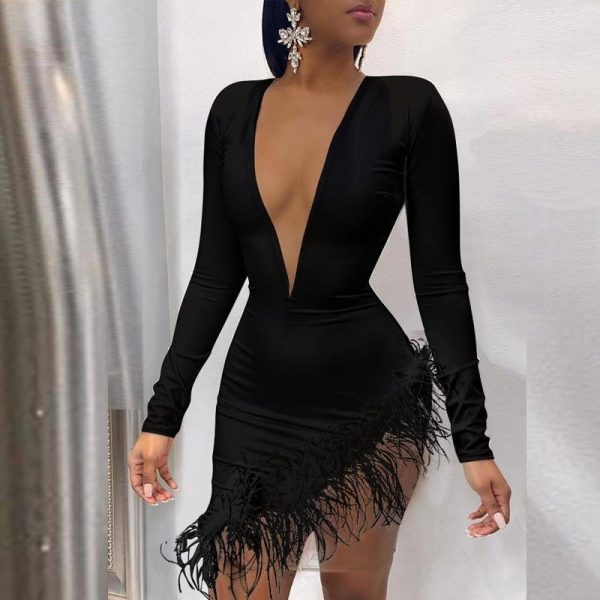 Be the first to review “Solid Deep V-Neck Feather Design Bodycon Dress”