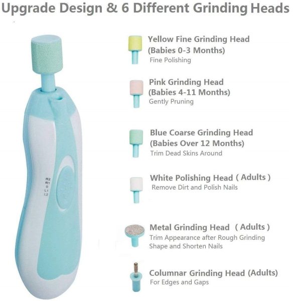 6-in-1 UPGRADED NAIL CARE SET – This electric baby nail file clipper has 6 grinding heads. 3* Filing Tools for Adults; 3*Cushioned Grinding Heads for Babies; 1*Main Unit; 1*Storage and Travel Case; 1* user manual. This manicure set can be used for newborns, infants, toddlers, kids from 0 to 12 months or above, as well as adults.