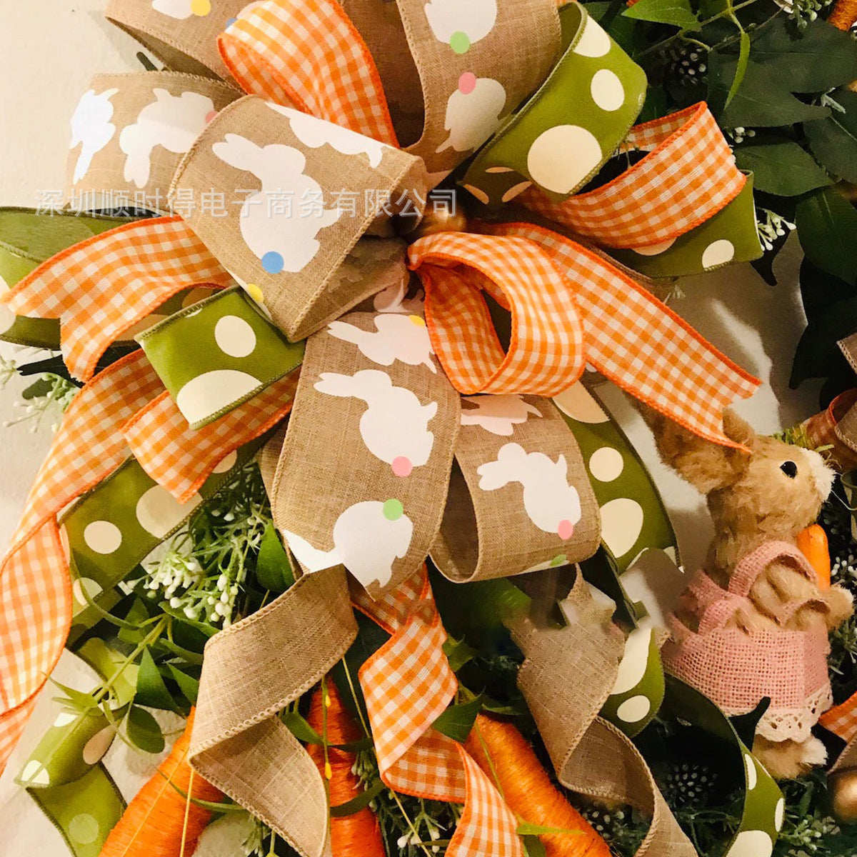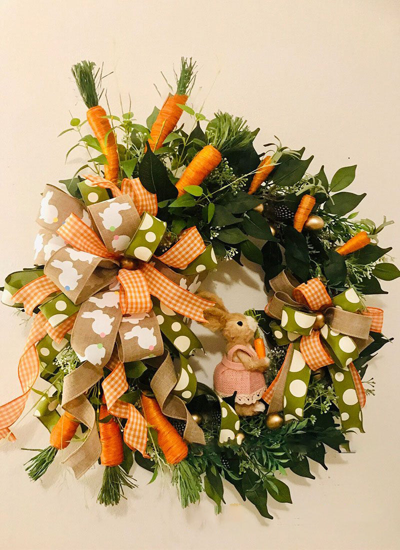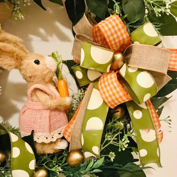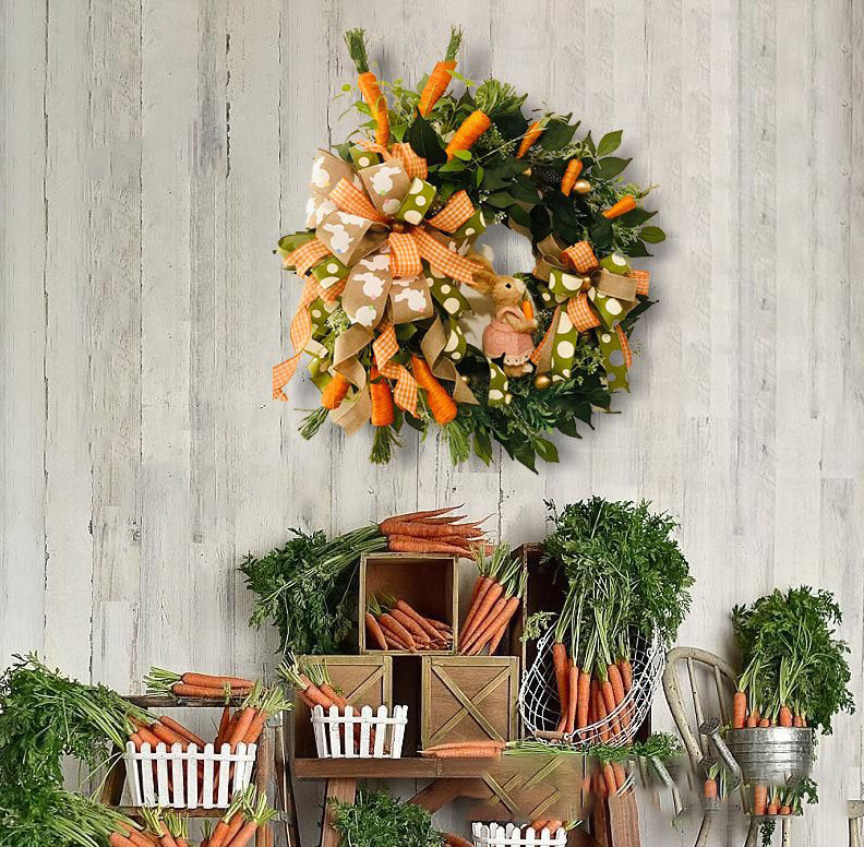 This Easter wreath is made of lifelike outdoor plants as a base, a cute bunny holding a carrot, an Easter style ribbon made into a gorgeous bow, and carrots and golden eggs adorn the whole wreath to make it more festive. This lovely wreath will surprise your guests at Easter. Welcome your guests, friends and family with this one-of-a-kind Easter Bunny Wreath.