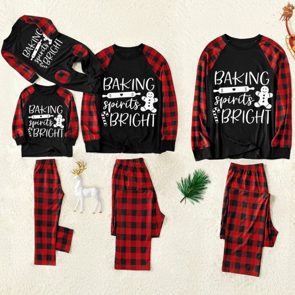 Christmas “Baking Spirits Bright” Letter Print Patterned Contrast Black top and Black & Red Plaid Pants Family Matching Pajamas Set With Dog Bandana