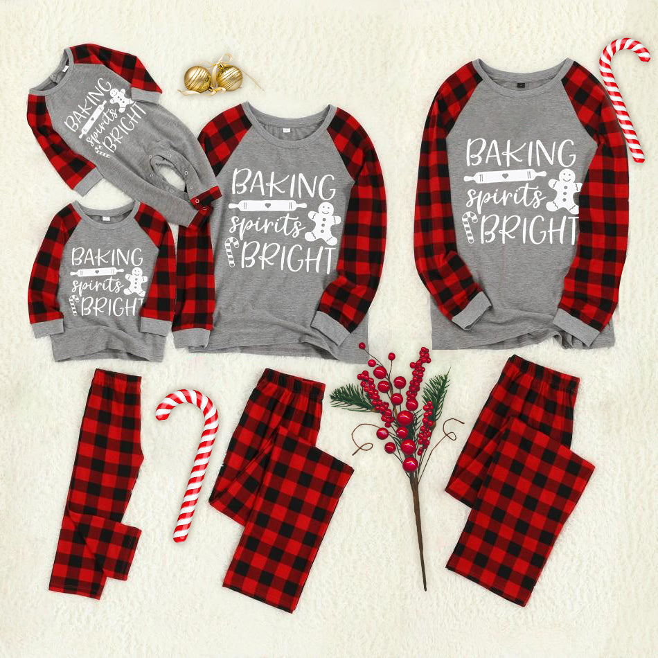 Christmas “Baking Spirits Bright” Letter Print Patterned Grey Contrast top and Black & Red Plaid Pants Family Matching Pajamas Set With Dog Bandana