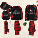 Christmas Cartoon cat Patterned “Meowy Christmas” Contrast top and Black & Red Plaid Pants Family Matching Pajamas Set