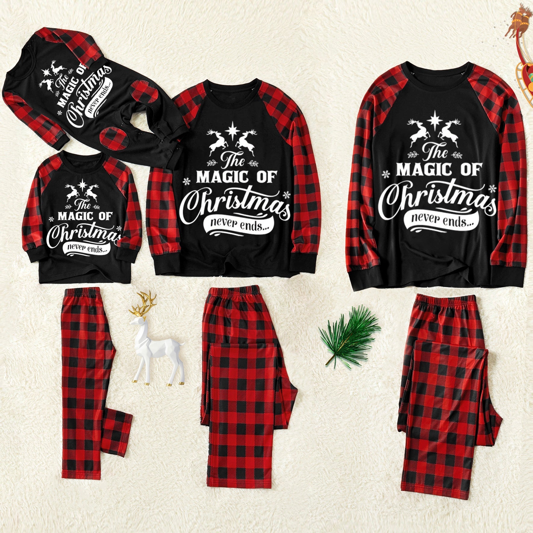 Christmas – The Maigc Of Christmas Never Ends…- Letter Print Patterned Contrast Black top and Black & Red Plaid Pants Family Matching Pajamas Set