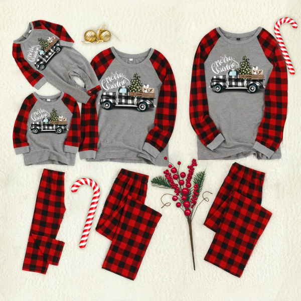 Christmas Tree & Truck Patterned “Merry Christmas” Letter Print Grey Contrast top and Plaid Pants Family Matching Pajamas Set With Dog Bandana