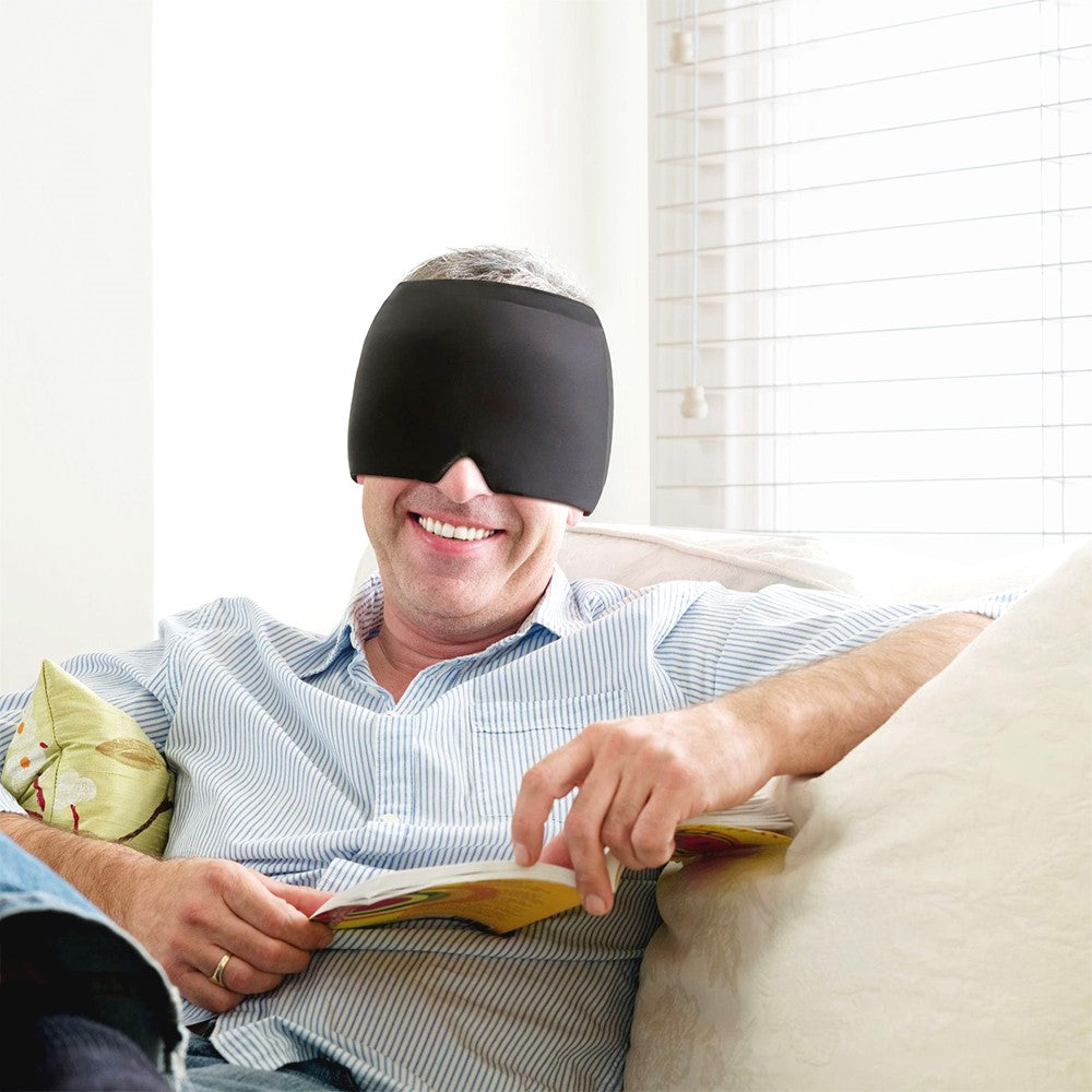 - This migraine remedy provides complete cold compression covering for your head and is simple to customise for the ideal fit. Unlike hard ice pack inserts, its soft gel construction does not apply painful pressure to certain places. With this single-piece, elastic headache mask, you may comfortably sit or sleep in bed.