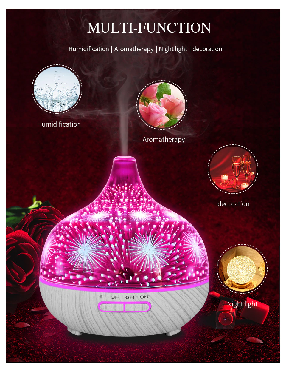 The colorful 3D lights are just magical. You can choose 7 color options, change in a cycle or fix on one specific color, add drops of your favorite essential oil to relieve stress, create a romantic and wonderful atmosphere.