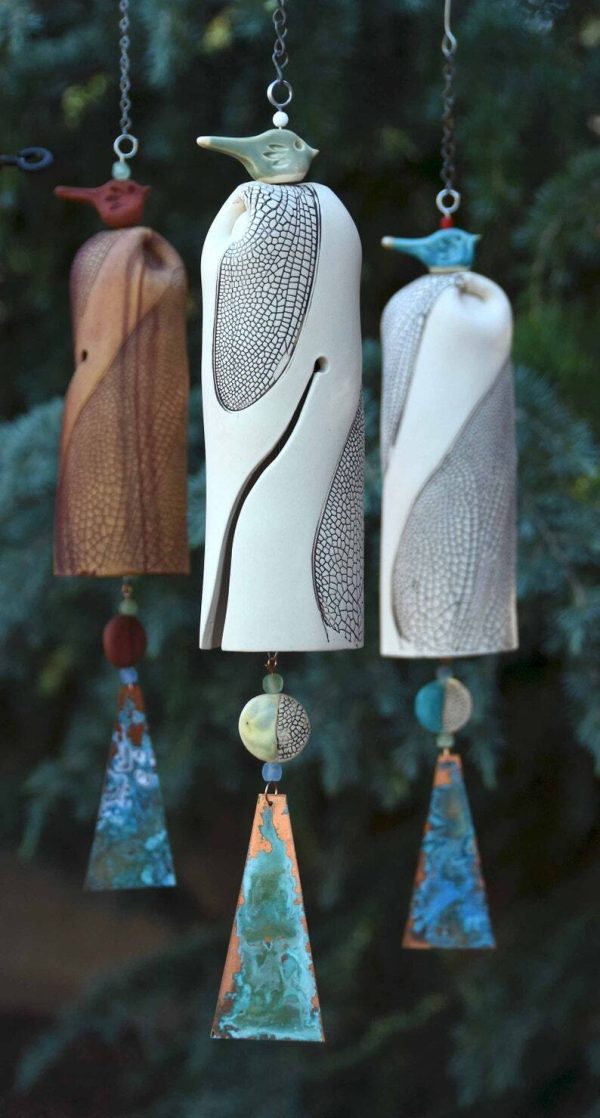 Features a beautiful dragonfly wings pattern, accented by a patina’d copper wind sail. A small ceramic sculptured bird in glazed blue or glazed green or Rustic Red sits atop the bell.
