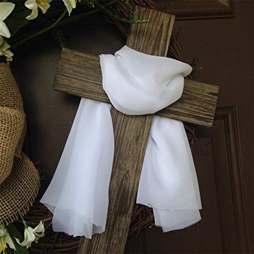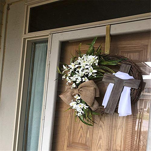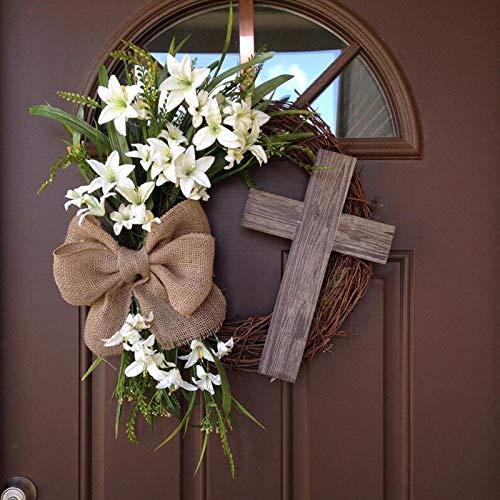 1.Beautiful Easter grapevine wreath with cream lilies, greenery and rustic burlap bow,accented with rustic cross and white veils over it.