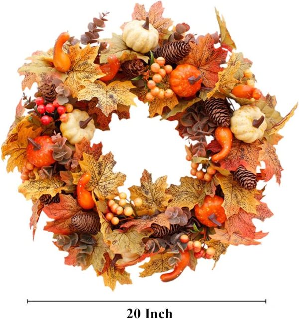 This artificial wreath decorated with artificial pumpkin, maple leaves, berries, and pine cones, brighten up your holiday season.