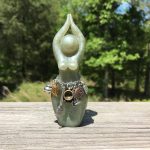 This goddess is meant to be a companion goddess, to travel with you, to share your experiences and stories, and to bless your space–your desk, your office, your pocket, with her power and essence. She is about five inches tall and very sturdy–she can get wet or be dropped without being damaged.