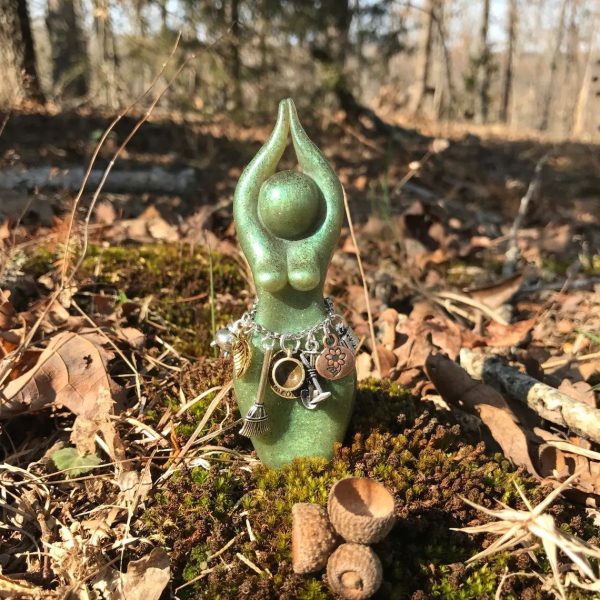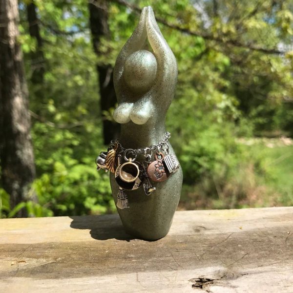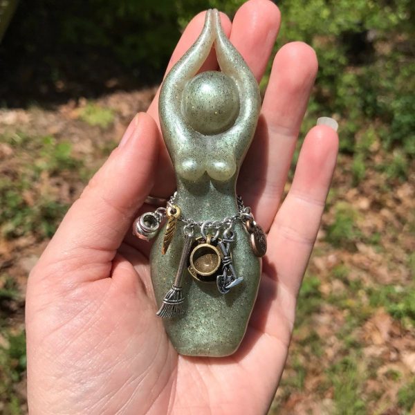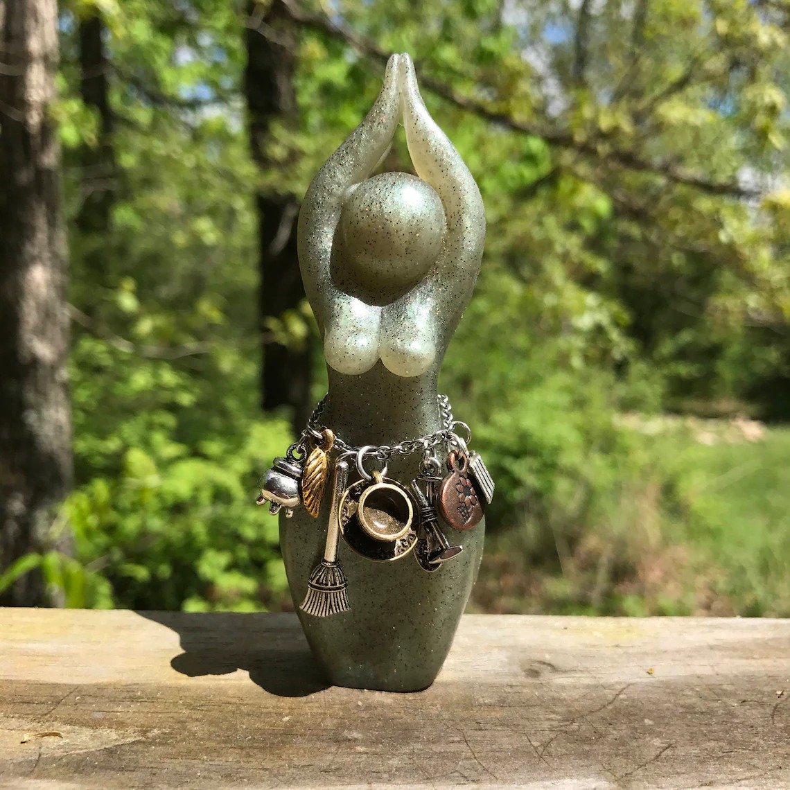 This handmade Green Witch Story Goddess carries the energy of the healing woman, medicine woman, natural healer. She is cast in resin and colored with a hand blended light mica pigment with topaz sparkles. This pigment is not commercially available and was created by us to represent herbal healing. Her silver-tone belt carries many tools of her trade.
