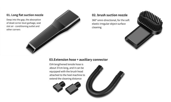 A variety of nozzle joint combination to meet different needs. Distribution of long flat suction nozzle, bruh suction nozzle, extension hose joint to meet the daily cleaning of all the use.
