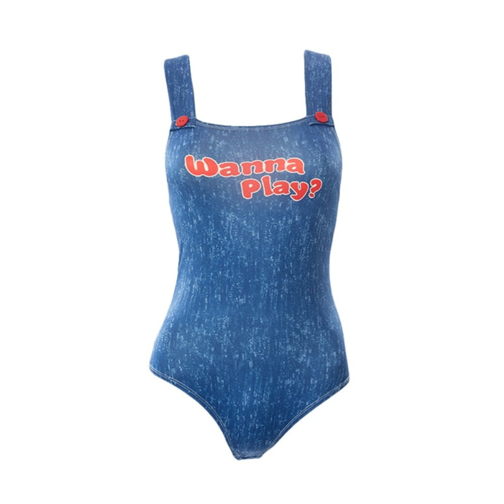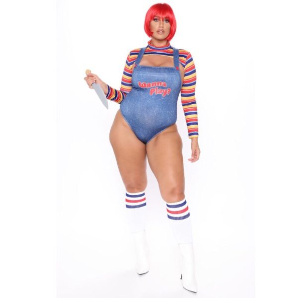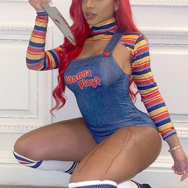 You’ll look great in the Killer Doll Bodysuit Costume, which consists of a sexy bodysuit with a romper and adorable button suspenders, a cuffed cheeky hem, and a zip-up back.