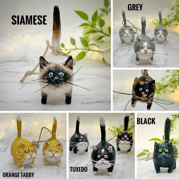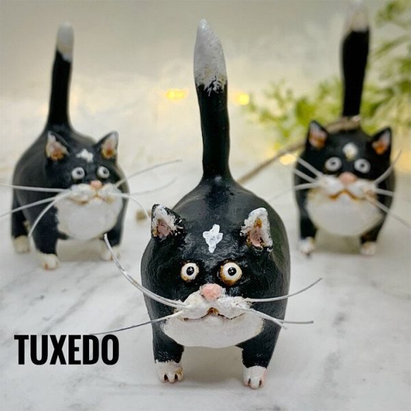 Original whimsical miniature kitty figurine. Hand sculpted and hand painted. Each one is unique and cute! Hang on a hook or a tree… or can be freestanding to keep watch over you wherever you need a little kitty cuteness!