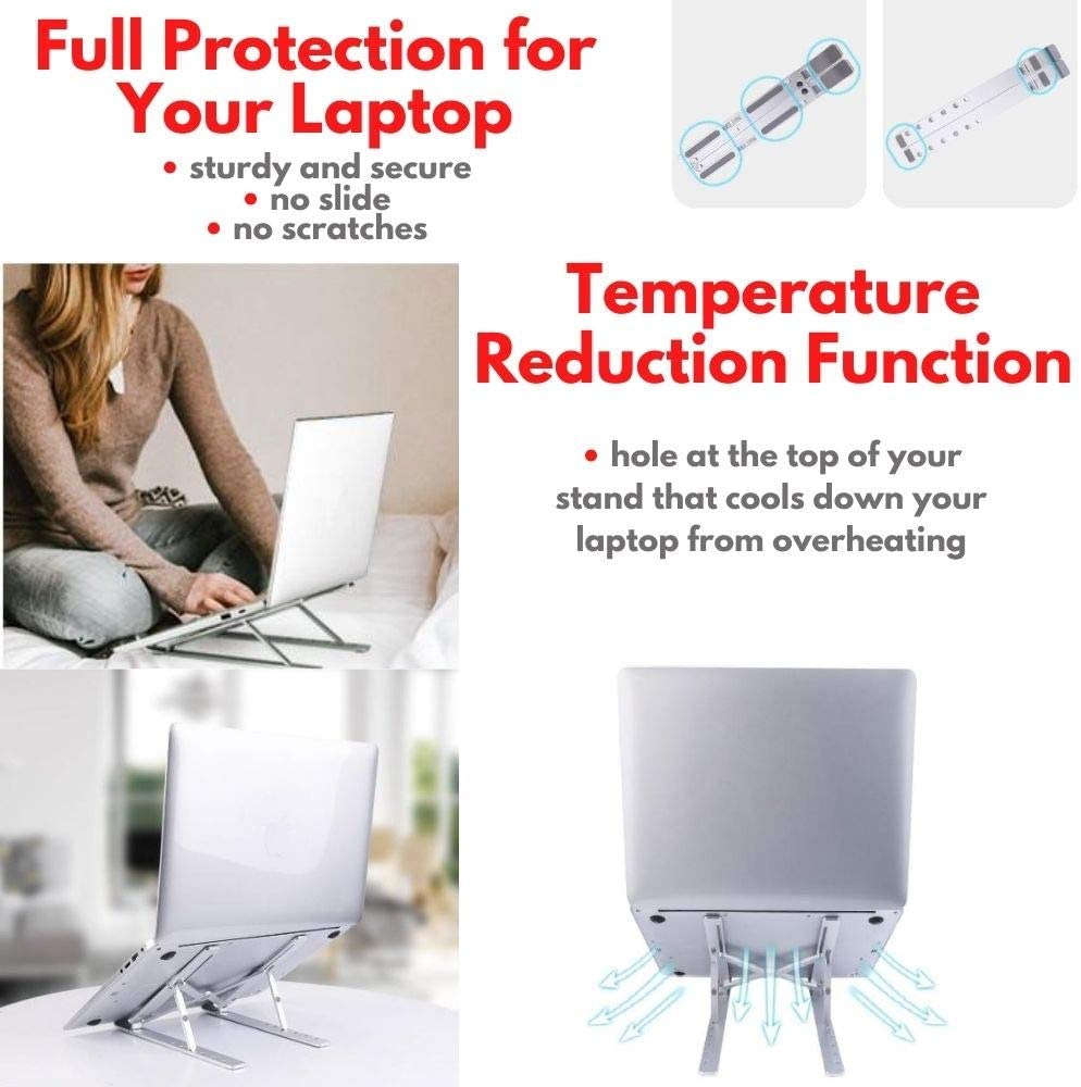 - ERGONOMIC MULTI-ANGLE DESIGN: The laptop & tablet stand works as a riser to elevate the laptop screen up to 6 flexible heights from 2.5” to 5.7” above the tabletop. It is a perfect desk partner to get rid of neck pain, back pain and eye strain while using a laptop.