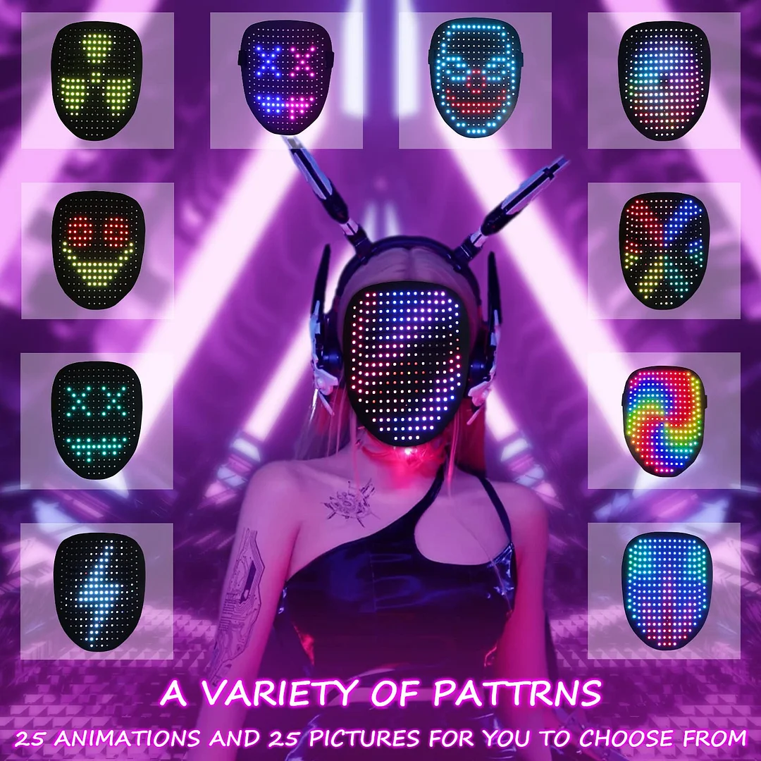 • Led Mask Has 25 Dynamic Display Modes And 25 Static Display Images, led full face mask Is Most Amazing Costumes&Cosplay Apparel mask,Attract Everyone’s Attention.