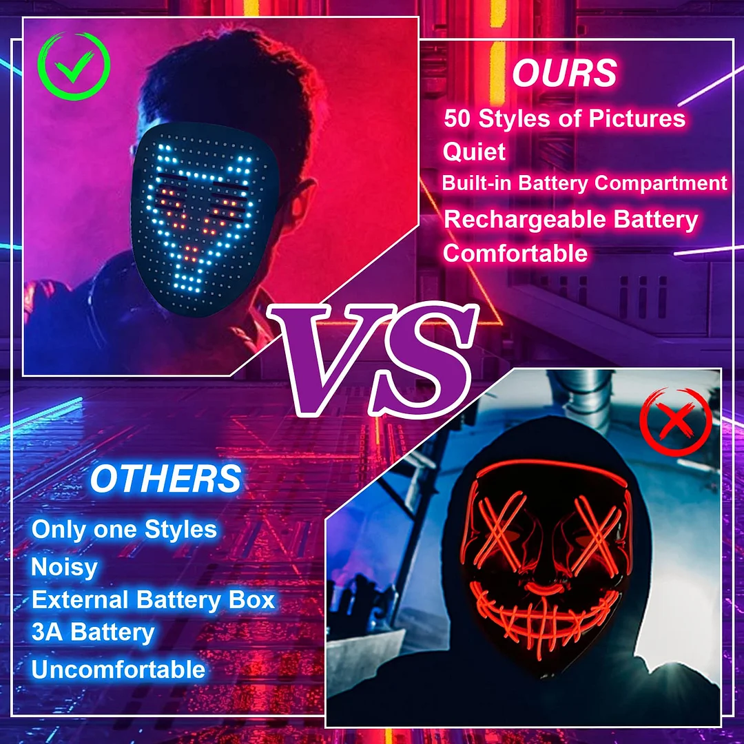 You can change your face any second, any occasion. Our Led Changing Face Mask is a Perfect Party Decorations and ideal Costume for Halloween or Christmas Party Outfit Dress Up,The Led Mask Party Costume.
