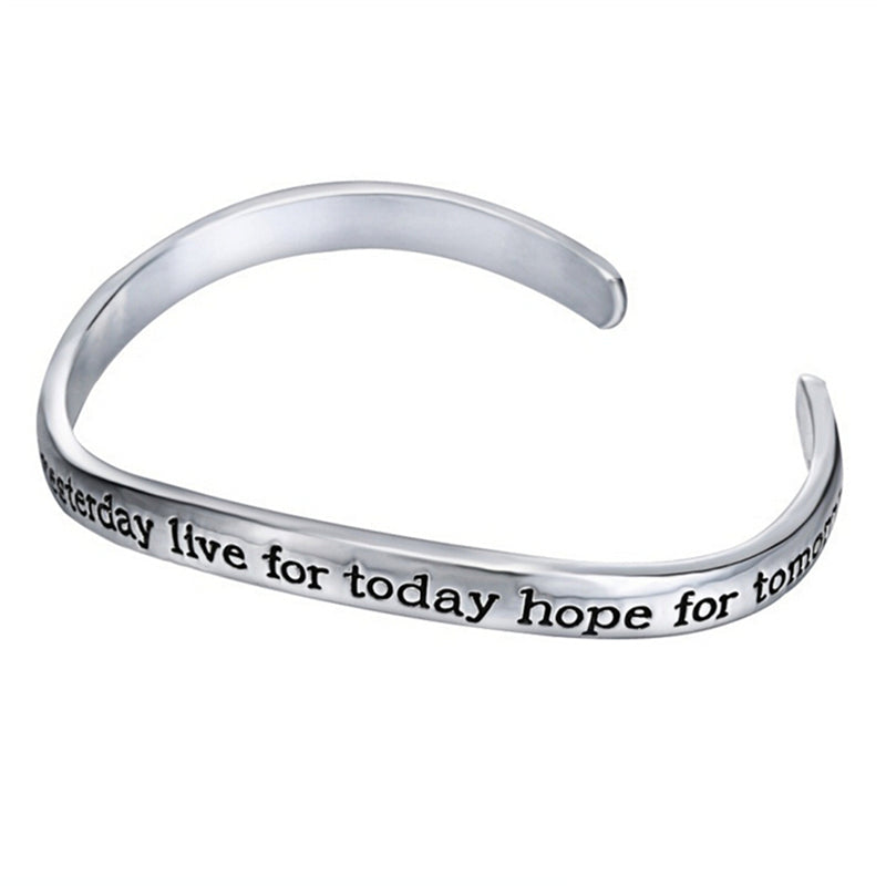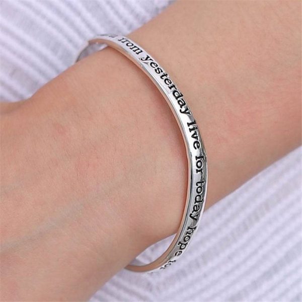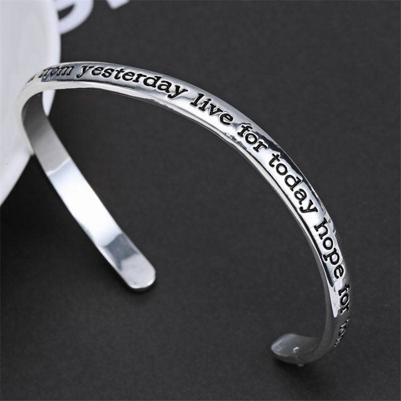 - ✅ FALL IN LOVE WITH ADORABLE DESIGN AND PACKAGING – This bracelet design is a timeless symbol of love, friendship, and motivation; versatile style, fashionable design, comfortable for everyday wear; stylish and meaningful! 7.2” Wrist size silver bracelet engraved with the words “Live the life you love learn from yesterday live for today hope for tomorrow”. This beautiful bracelet comes with a PREMIUM Black Velvet Pouch.