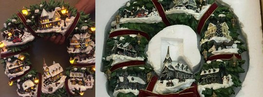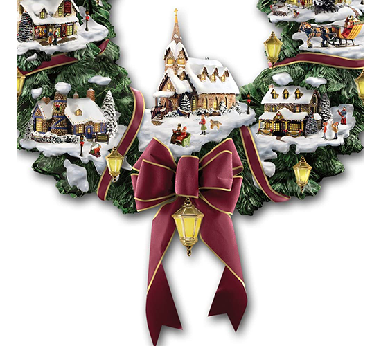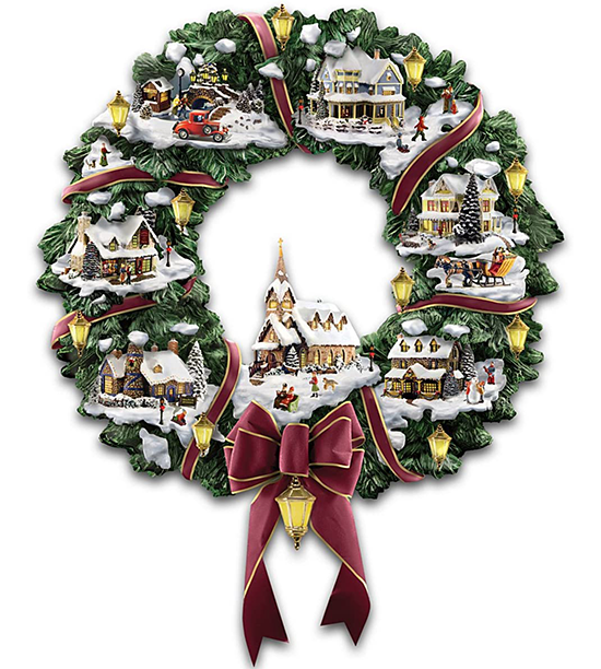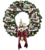 Brighten your holidays with an amazing Collectibles Market first inspired by ! For the first time, the beloved Victorian homes, cottages, and a warmly lit church come to life in an illuminated wreath, exclusively from The ! What a unique holiday home decor dream-come-true, handcrafted and hand-painted by skilled artisans – a one-of-a-kind masterpiece!The glowing windows of every building and an array of welcoming lanterns beckon you deep into a winter wonderland where children busily build a snowman, carolers sing, and villagers enjoy a horse-drawn sleigh ride!