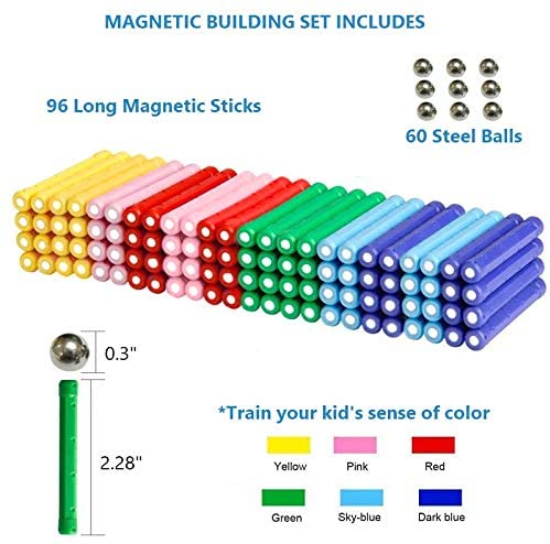 - PACKAGE INCLUDES 156 PIECES – Our magnetic building set includes 156 pieces: 96pcs magnetic sticks with length 1inch and 60pcs non-magnetic steel balls. This set lets kids build, play and learn for hours of educational entertainment. It’s recommended for children aged 3+.