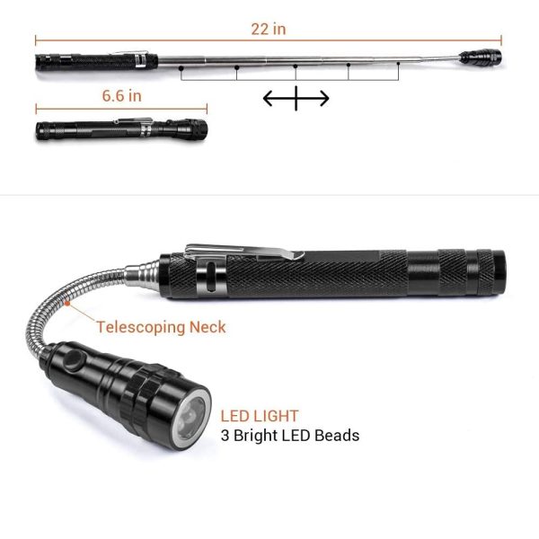 - POWERFUL MAGNETIC PICK UP TOOL – Our magnetic LED pickup tool has the head of the flashlight stick integrated with a strong magnet so you can pick up metal components easily and telescope the light to the angle you need.