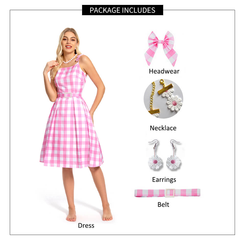 - Literally gives everything you need, you will get you see. Like pink plaid dress, belt, daisy necklace, headwear and earrings.