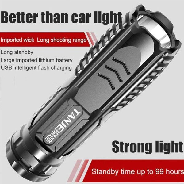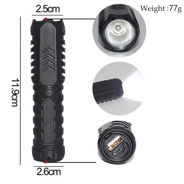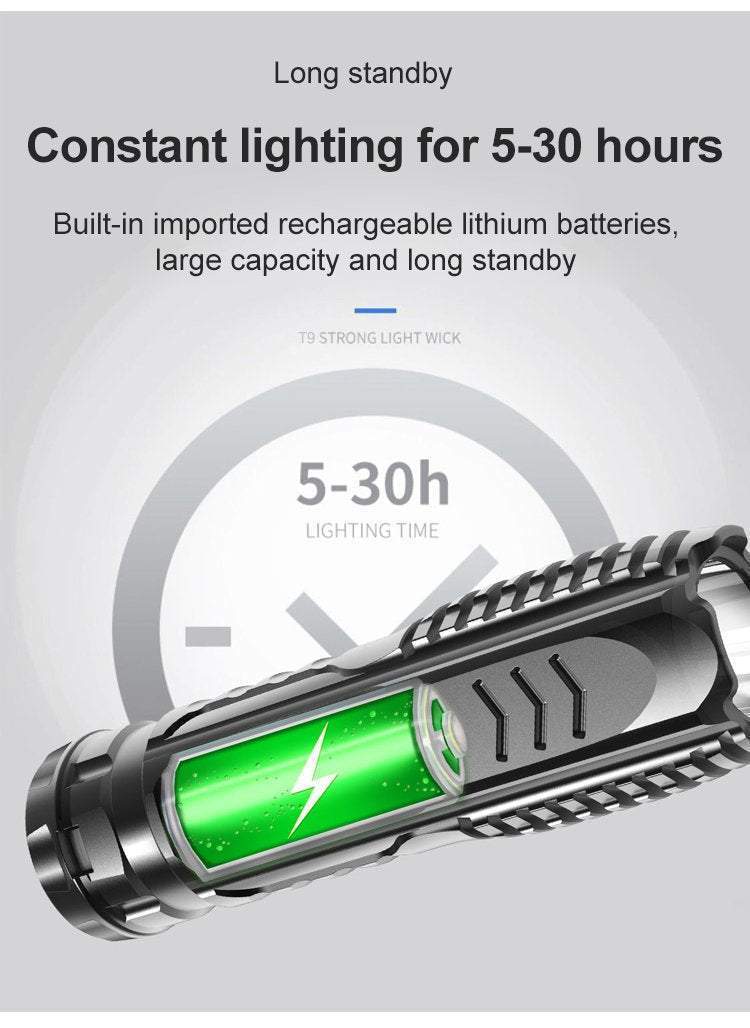 Multifunctional Rechargeable Flashlight waterproof and zoomable: the waterproof torch can work well on rainy days, but must not be placed directly into water. Press and pull the head of the torch to adjust the focus from narrow to wide. The wide beam has a larger light area and the narrow beam has a larger light area