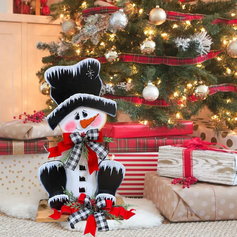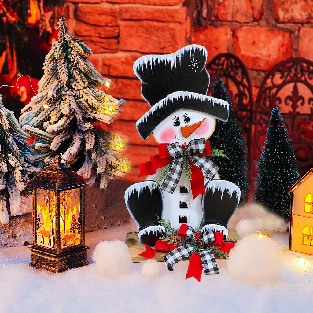 PREMIUM HANDMADE CRAFTS: 💁♀️He features a top hat frosted with sparkly snowy paint. 🥰The base of the design also features red velvet ribbon and a buffalo check ribbon. The bows are embellished with frosted pine, berries, and a mini pine cone.