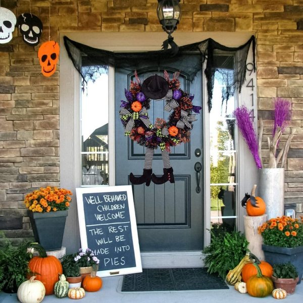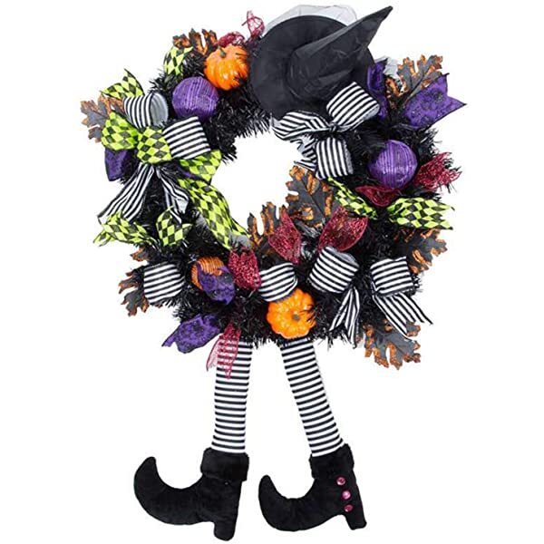 - Halloween wreath made of high quality materials, non-toxic and odorless, it consists of classic Halloween elements such as witch’s legs, pumpkins and shoes and hats, creating an eerie Halloween atmosphere.