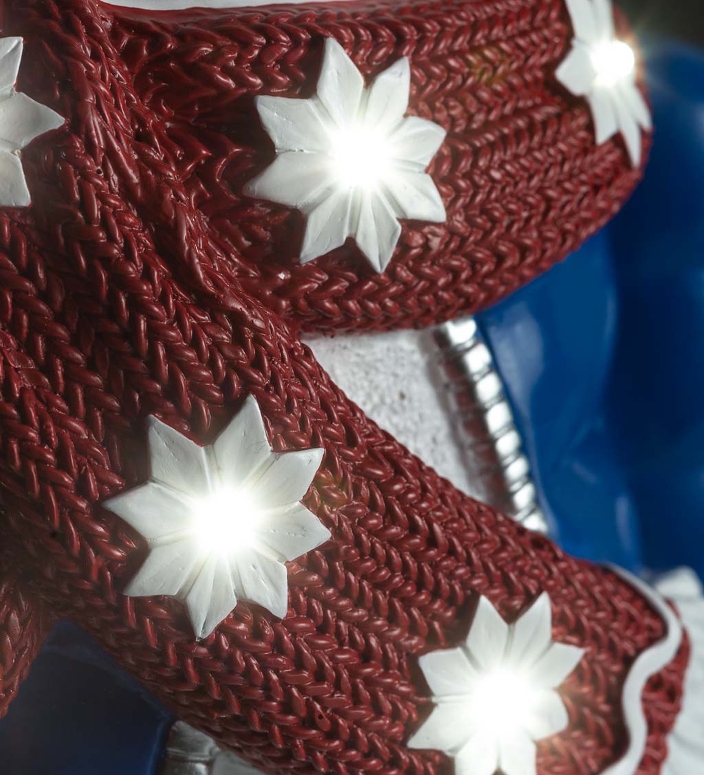 • 8 bright white LED lights stud the Snowman’s scarf and body