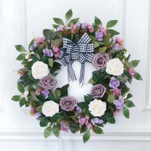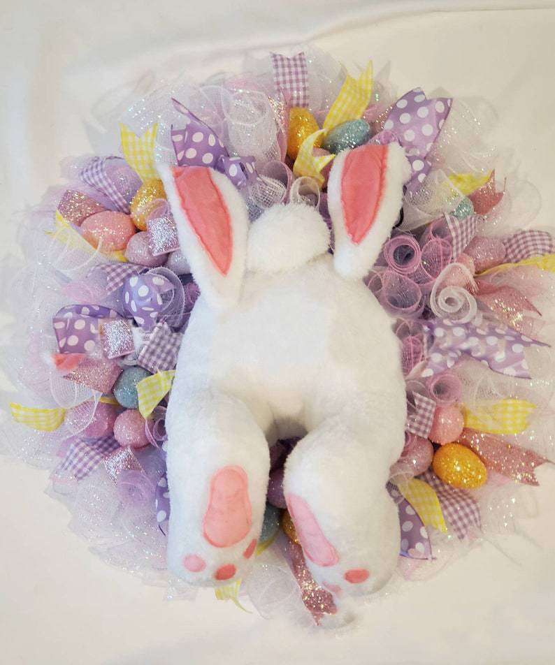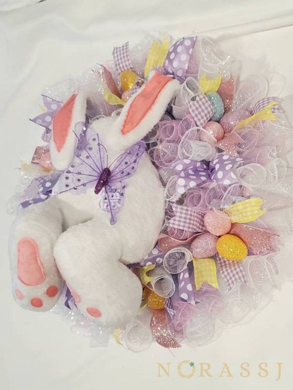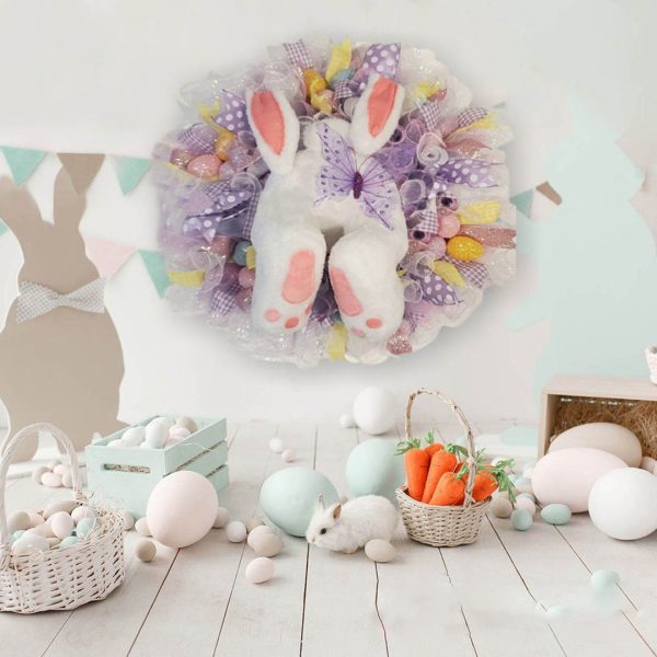 This garland uses purple tones and is made of shiny eggs and gauze ribbons, with the cutest rabbit in the middle. This is a great bunny accessory with butt and ears Easter wreath. The perfect Easter gift will be a special gift.