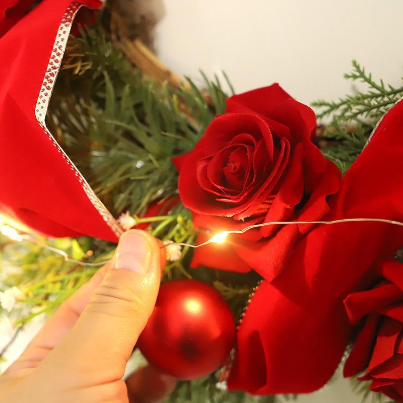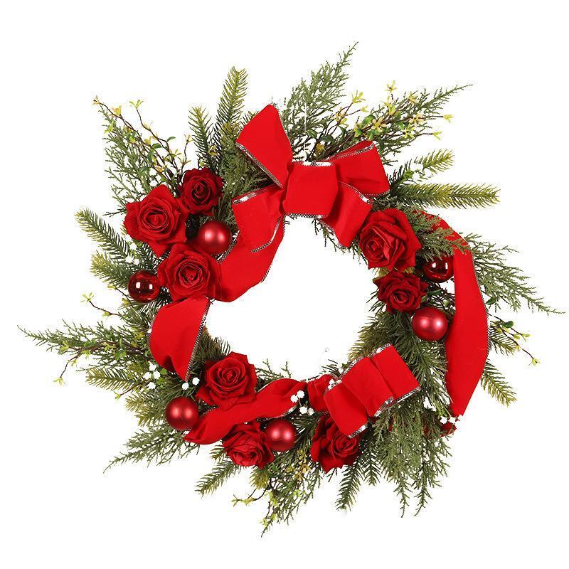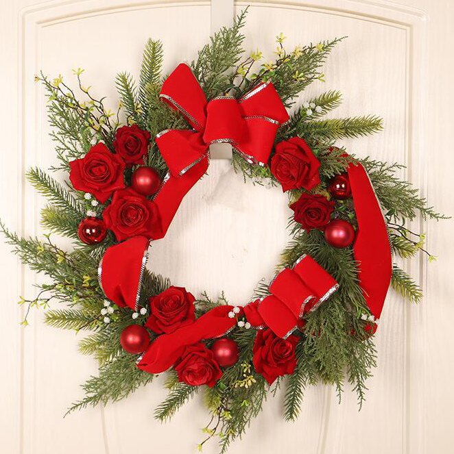 • Material: Outdoor realistic greenery, artificial red velvet bowknot and rose. Plastic red ball ornaments.