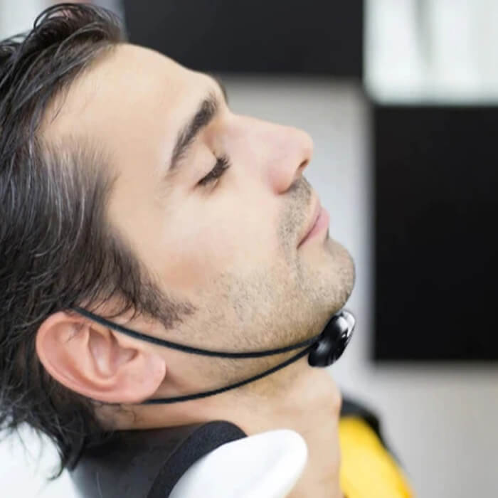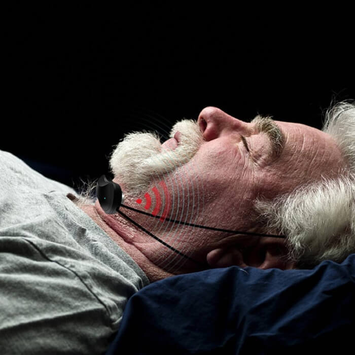 The device detects snoring by using intelligent voice technology. It applies vibration pulses of different frequencies to the hypoglossal nerve and mandibular muscles. This tightens the muscles, adjusts breath rhythm, and makes breathing smoother.