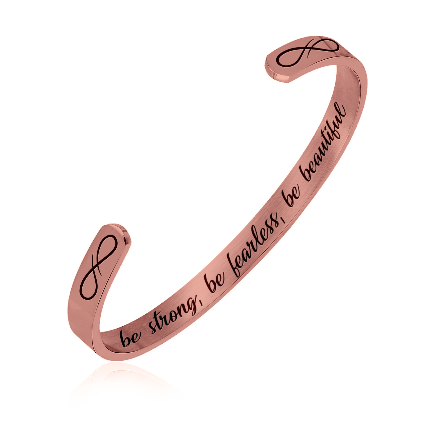 - FALL IN LOVE WITH BEAUTIFUL DESIGN AND PACKAGING – Stylish Rose Gold Cuff Bracelet with the words “Be Strong, Be Fearless, Be Beautiful” beautifully engraved. Bracelet comes with a PREMIUM Black Velvet Pouch Which Makes it a Great Gift for Birthdays, Mother’s Day, Christmas, holidays, and for Sport Lovers