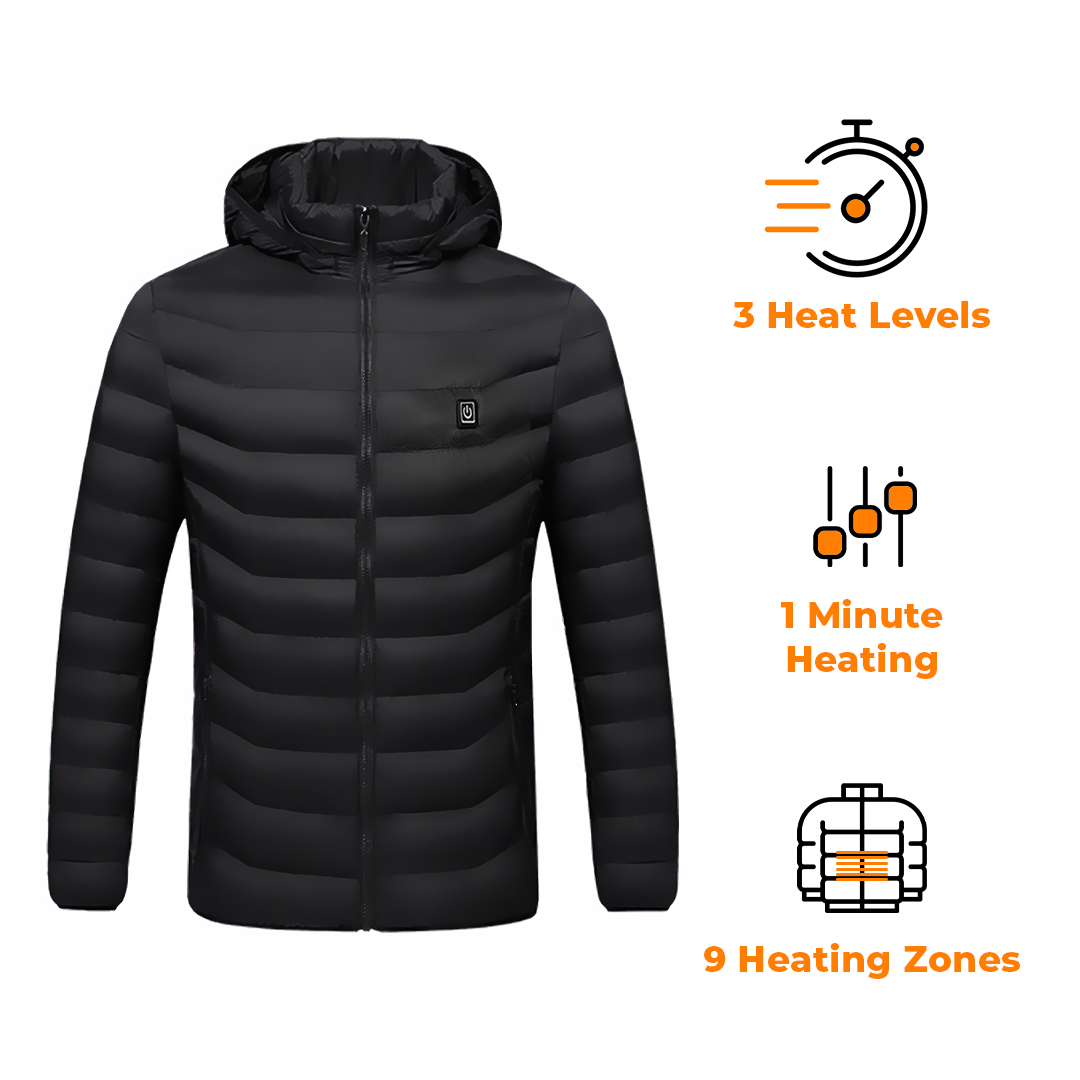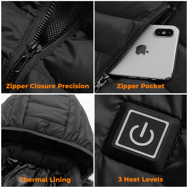 - 9 HEATING ZONES – Warmth to the neck, full back with 5 heating zones and 2 heating zones in the front pockets.