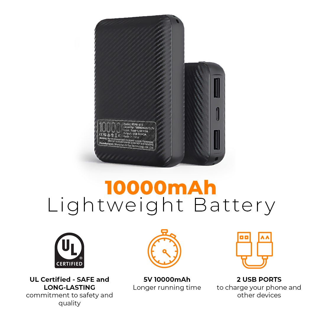 The Certified Li-battery Portable 10000mAh 5V Power bank rechargeable battery allows you to charge your phone while you are getting warmed with 2 USB ports.
