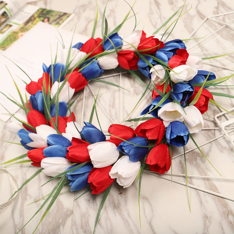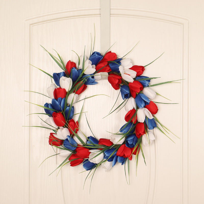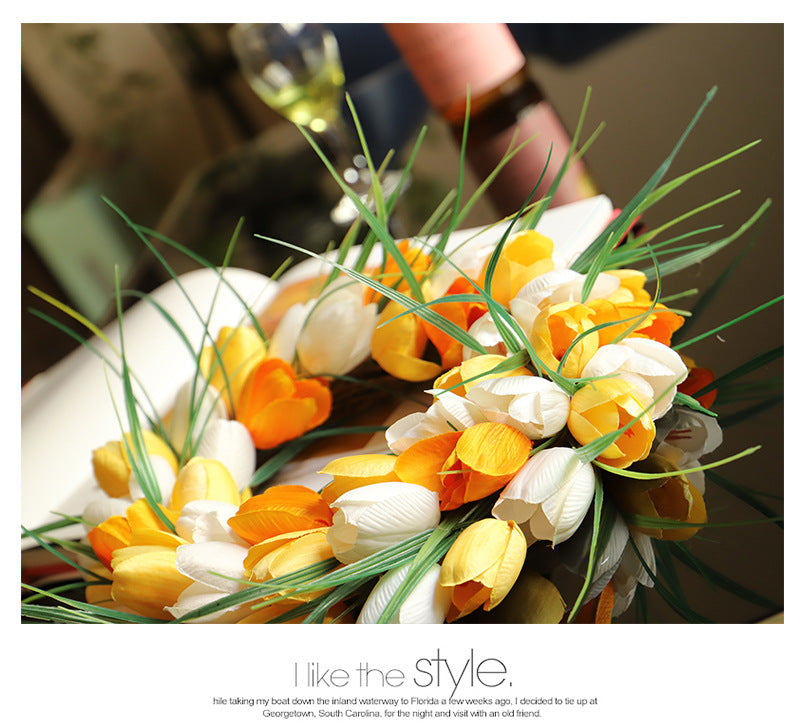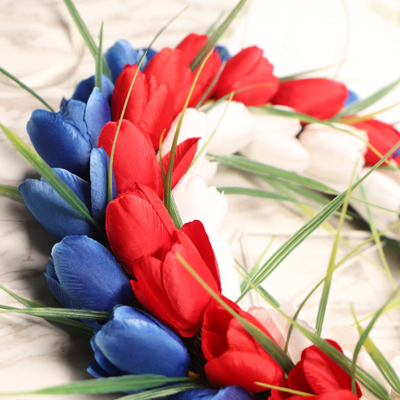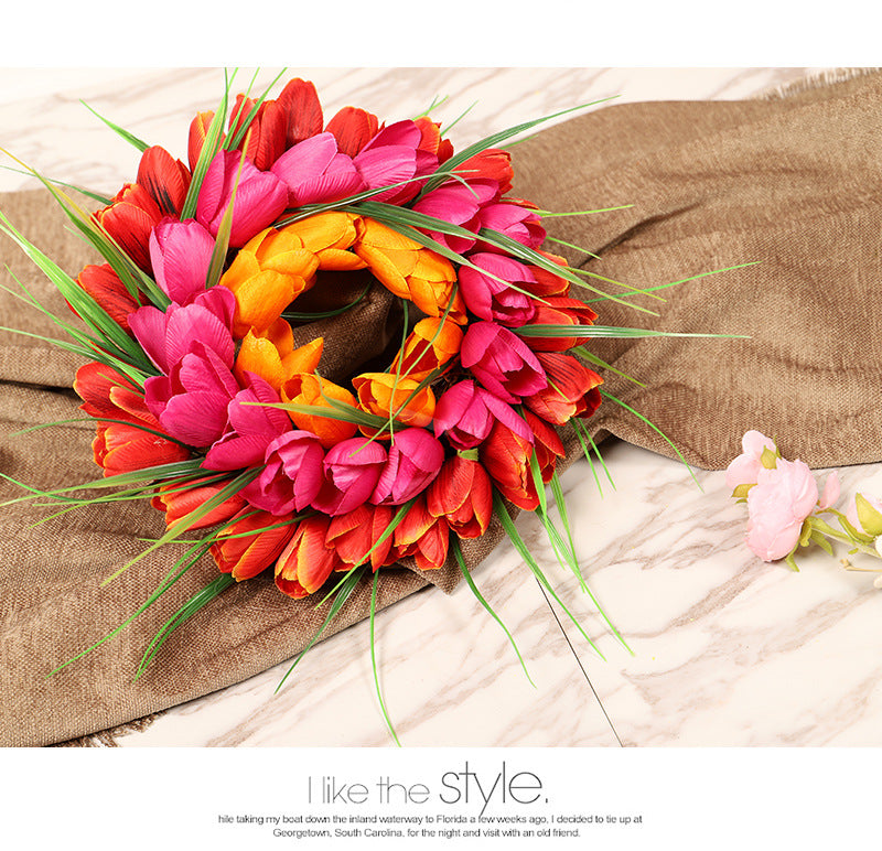Beautiful and full designer spring floral wreath. Handcrafted on a natural vine base and quality polyester tulip heads. Sure it will brighten your spring and summer home. And it will be the perfect house warm gift.