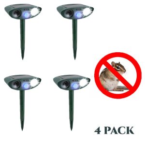 - ENVIRONMENTAL FRIENDLY AND EASY TO USE: Naturally drives chipmunks and other animals out without killing them. Made of anti-UV and waterproof material, suitable for all weather conditions. SOLAR energy technology, charge itself under sun, wireless and rechargeable. Don’t worry about getting new batteries anymore! Repeller features FLASHING light to scare the animals.