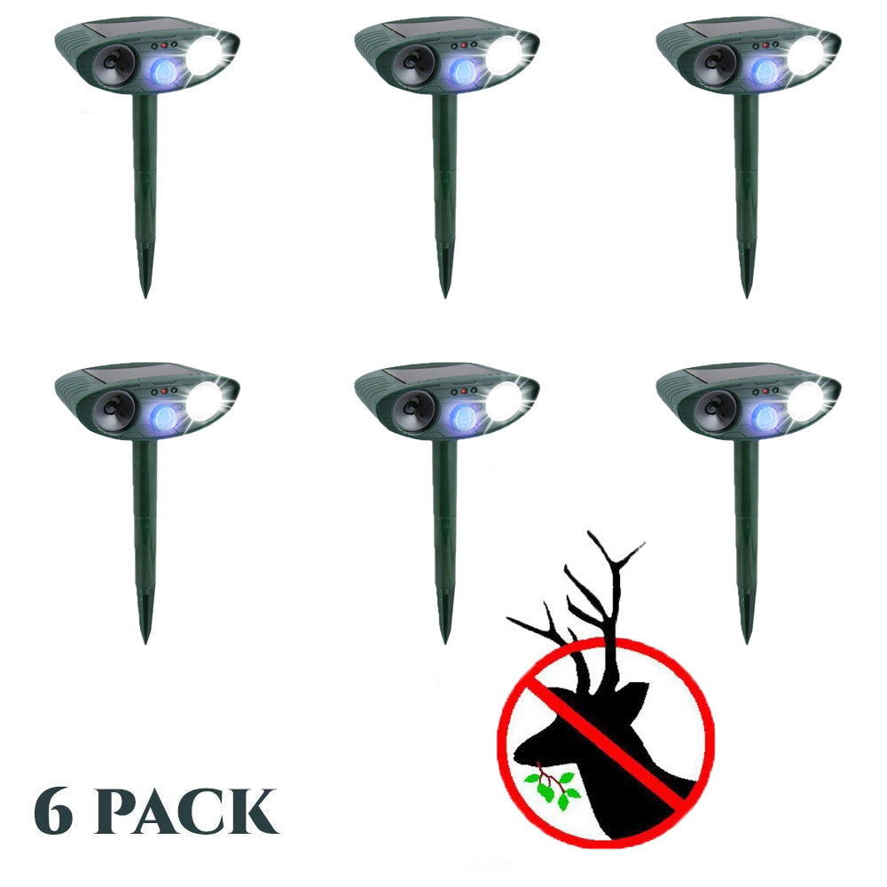 - ENVIRONMENTAL FRIENDLY AND EASY TO USE: Naturally drives deer and other animals out without killing them. Made of anti-UV and waterproof material, suitable for all weather conditions. SOLAR energy technology, charge itself under sun, wireless and rechargeable. Don’t worry about getting new batteries anymore! Repeller features FLASHING light to scare the animals.